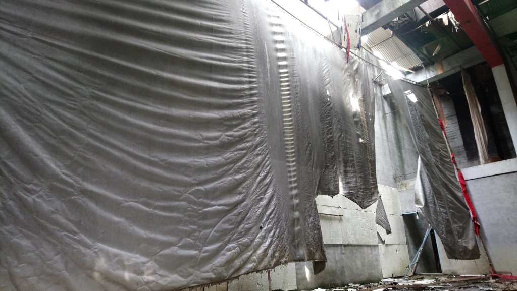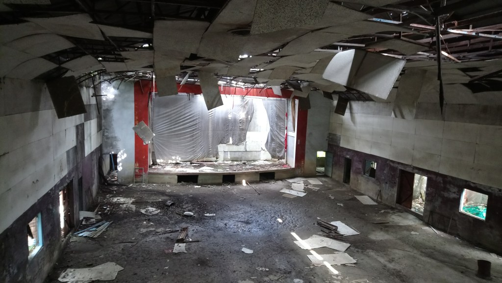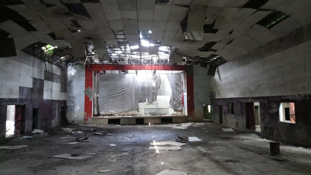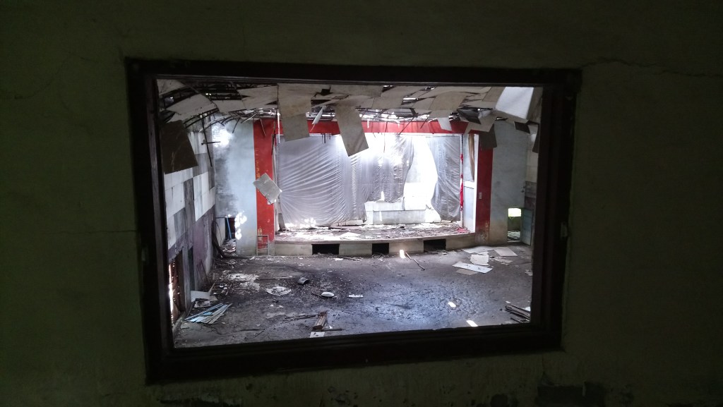 There’s not much left in the theater, but it’s nice to see the screen still hanging. There are no projectors or seats left.